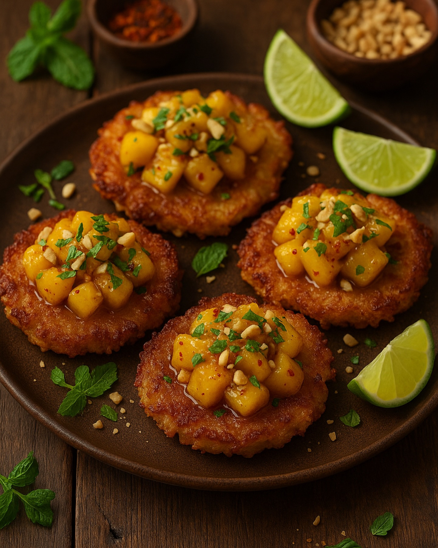 Instructions: 1. Prepare rice cakes: In a bowl, mix rice, coconut milk, egg, cornstarch, and salt. Form into small patties. Pan-fry in oil over medium heat until crispy and golden on both sides. Drain on paper towels. 2. Make pineapple topping: In a skillet, sauté pineapple in butter for 2–3 minutes until slightly golden. Add honey, chili flakes, lime zest, juice, and salt. Stir and cook 1–2 more minutes until syrupy. 3. Assemble: Spoon pineapple over hot rice cakes. Top with crushed peanuts and fresh herbs. Serve immediately with extra lime on the side.