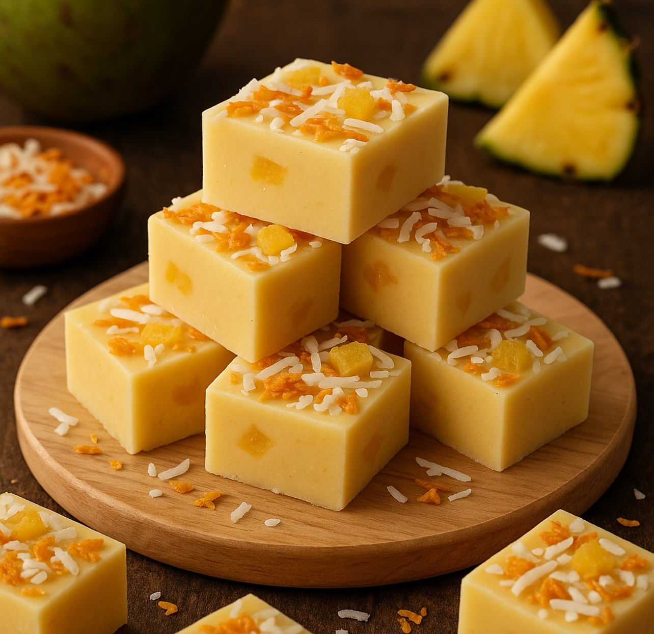 Creamy white chocolate fudge infused with juicy pineapple and topped with toasted coconut — a bite of tropical paradise in every square.