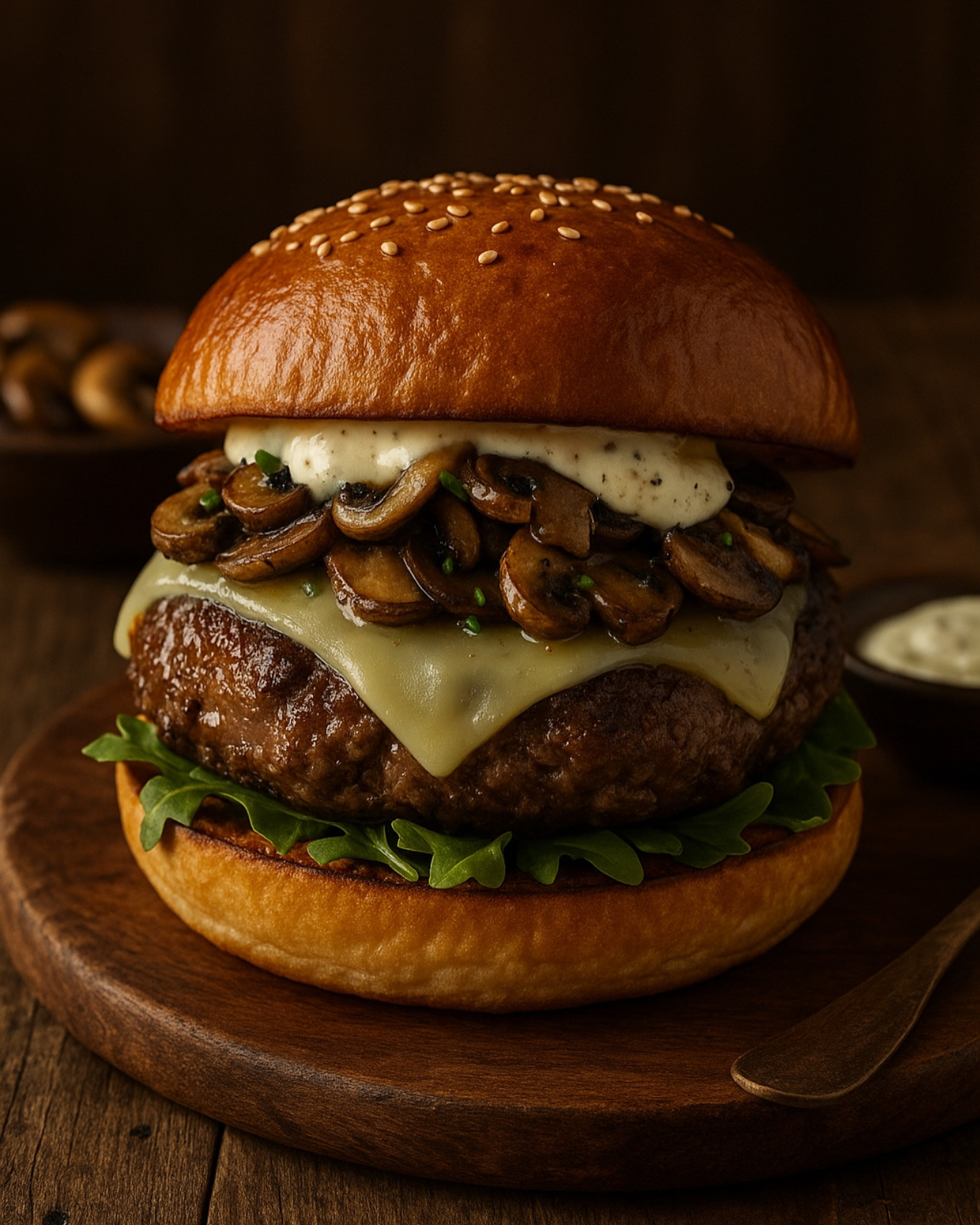 A juicy seared beef patty topped with sautéed mushrooms, melted Swiss cheese, and a rich garlic aioli — all layered inside a toasted brioche bun with a hint of truffle oil. It’s savory, earthy, creamy, and totally unforgettable.