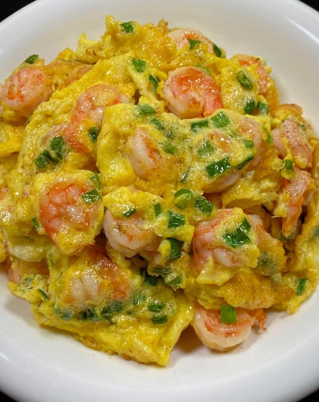 Trứng chiên nõn tôm * Chuẩn bị nguyên liệu - Trứng gà, tôm nõn, hành, hạt tiêu, muối, bột mì * Cách chế biến 1. Các bạn có thể mua tôm bóc sẵn trong siêu thị hoặc mua tôm tươi về, bóc vỏ bỏ chỉ lưng. Sau đó, ướp tôm với một thìa bột mì, chút hạt tiêu và muối, trộn đều lên và ướp 15 phút 2. Đập trứng gà ra bát, cho thêm muối và hành lá thái nhỏ vào rồi khuấy đều 3. Cho dầu vào chảo, đun nóng lên rồi đổ tôm vào xào săn lại. Sau đó, đổ trứng vào, láng đều chảo để trứng dàn đều ra. Chiên đến khi hai mặt vàng đều là được