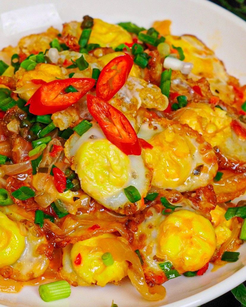 Thành phẩm đĩa trứng cút chiên rim nước mắm vàng giòn bên ngoài, mềm béo bên trong, nước mắm sánh đậm đà quyện cùng hành tây ngọt thơm và tiêu xanh cay nhẹ.