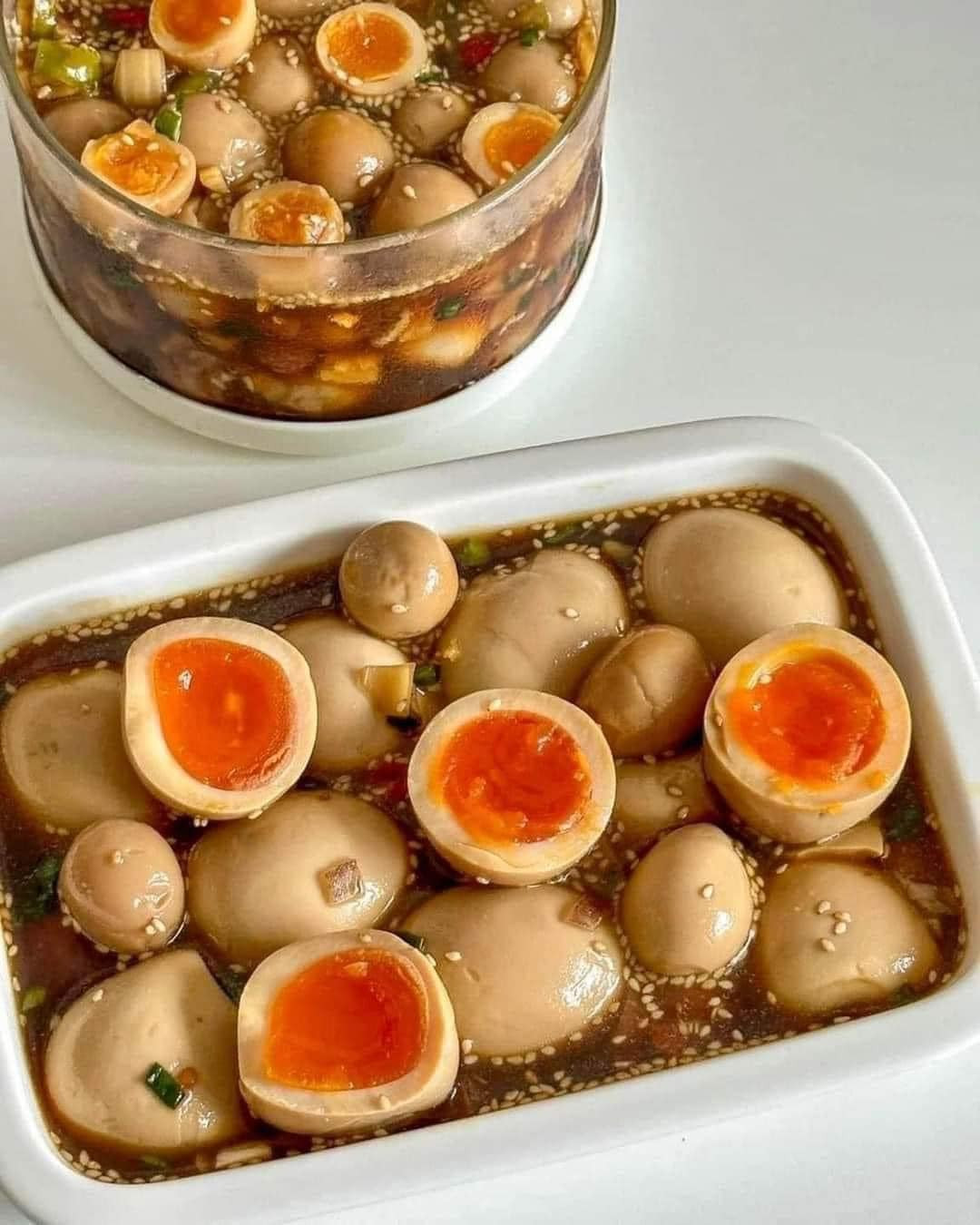 TRỨNG GÀ NGÂM XÌ DẦU TẠI NHÀ SIÊU NHANH SIÊU DỄ NGUYÊN LIỆU - Trứng gà ta: 10 quả - Xì dầu (nước tương): 200ml - Nước trắng: 200ml - Siro ngô: 4 thìa canh ăn phở, có thể thay bằng mật ong hoặc đường vàng: 2 thìa canh ăn phở) - 1/2 củ hành tây - 4-5 quả ớt cay - Hẹ hoặc hành lá: 10 cây - Hành củ tím: 2 củ - R.ượ.u trắng: 1 thìa canh (có r.ượ.u mirin là ngon nhất và chuẩn vị) - Dầu mè: 1 thìa cà phê - Các gia vị khác: dấm ăn và muối tinh để cho vào luộc trứng, vừng rang chín: 1 thìa canh CÁCH LÀM - Trứng rửa sạch nhẹ nhàng từng quả một, nếu để trứng trong tủ lạnh thì phải để trứng trở về nhiệt độ phòng mới đem luộc - Đun sôi nước, cho vào 2 thìa canh giấm và 1 thìa cà phê muối, nước sôi đặt từng quả trứng vào thìa to và nhẹ nhàng thả xuống nồi, thả mạnh trứng dễ vỡ nứt - Căn từ lúc thả trứng vào tính thời gian luộc trứng được 7-8 phút (trứng sẽ hơi lòng đào) thì vớt ra bát nước đá thật lạnh để trứng ko tiếp tục chín, sau trứng dóc vỏ dễ bóc hơn. Ngâm trứng đến khi nguội hẳn rồi hãy vớt ra - Hành lá hoặc hẹ rửa sạch thái nhỏ - Hành tây,hành củ tím thái nhỏ, ớt thái lát - Trộn phần sốt ngâm trứng: cho xì dầu, nước trắng, r.ượ.u, siro ngô hoặc mật ong đun sôi, nêm nếm cho vừa miệng và để nguội. - Trộn hành lá hoặc hẹ thái nhỏ, hành tây, hành củ tím, ớt, dầu mè, vừng rang vào phần nước sốt - Trứng bóc vỏ - Xếp trứng vào hộp, đổ phần nước sốt vào ngâm khoảng 6 giờ là ăn được hoặc cất ngăn mát tủ lạnh qua đêm hôm sau mang ra ăn. Chúc cả nhà thành công với công thức trên nhé #nghiệnnấuăn #nghiện_nấu_ăn #nghiennauan #Nghiện_Nấu_Ăn