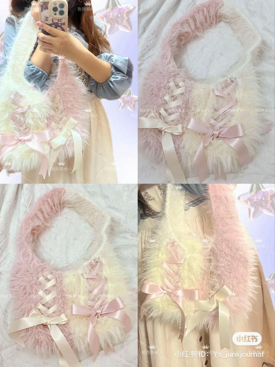 Túi xách lông xù tự chế với dây ruy băng trang trí màu hồng