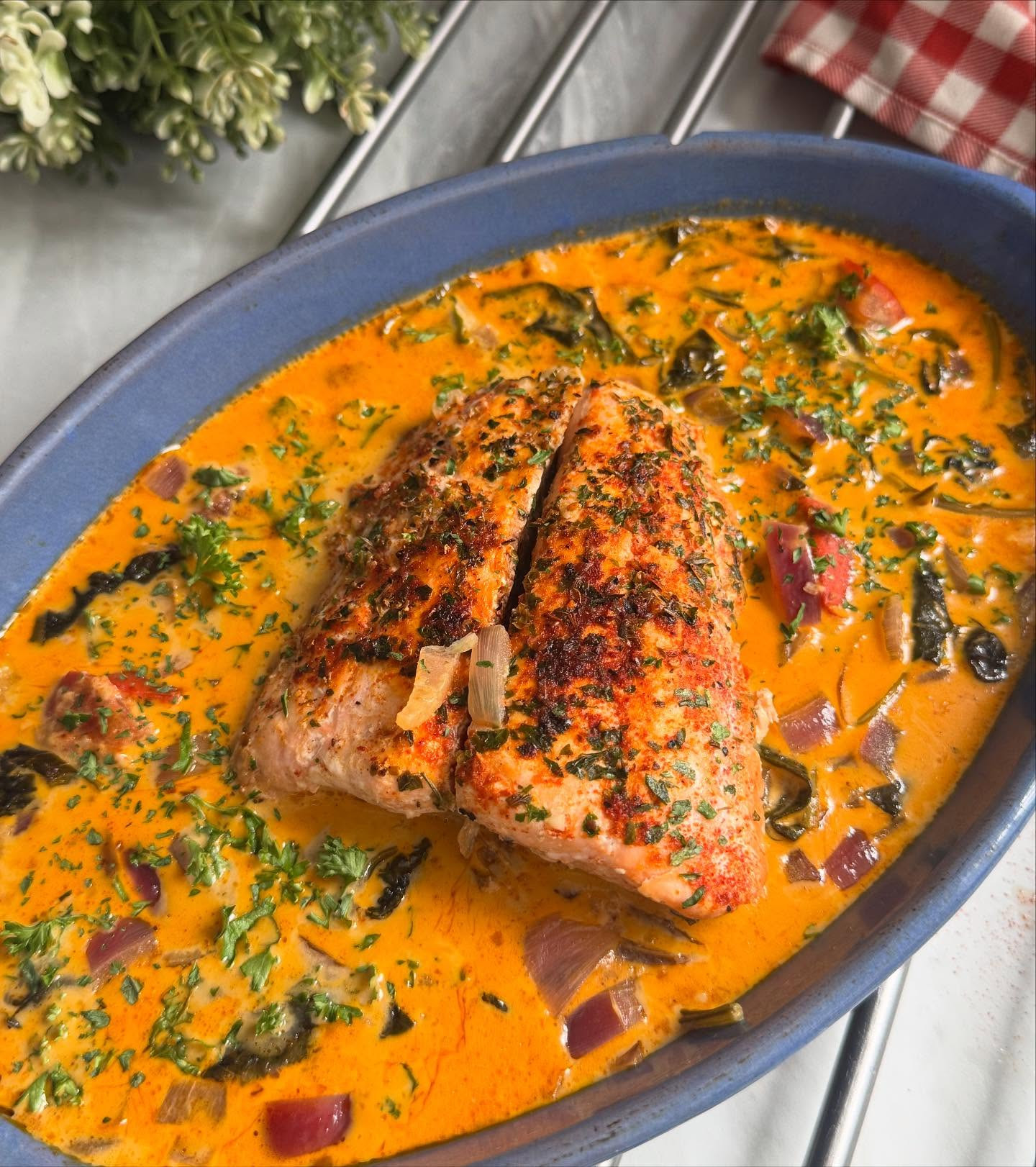 Ingredients • 2 salmon fillets (about 150–170g each) • 1 tbsp olive oil • 1 tbsp butter • ½ red onion, finely chopped • 3 cloves garlic, minced • 100g sun-dried tomatoes, chopped • 60g baby spinach • 150ml double cream • 100ml chicken or vegetable stock • 1 tsp paprika • 1 tsp dried Italian herbs (or oregano + basil mix) • Salt & black pepper, to taste • Fresh parsley, to garnish
