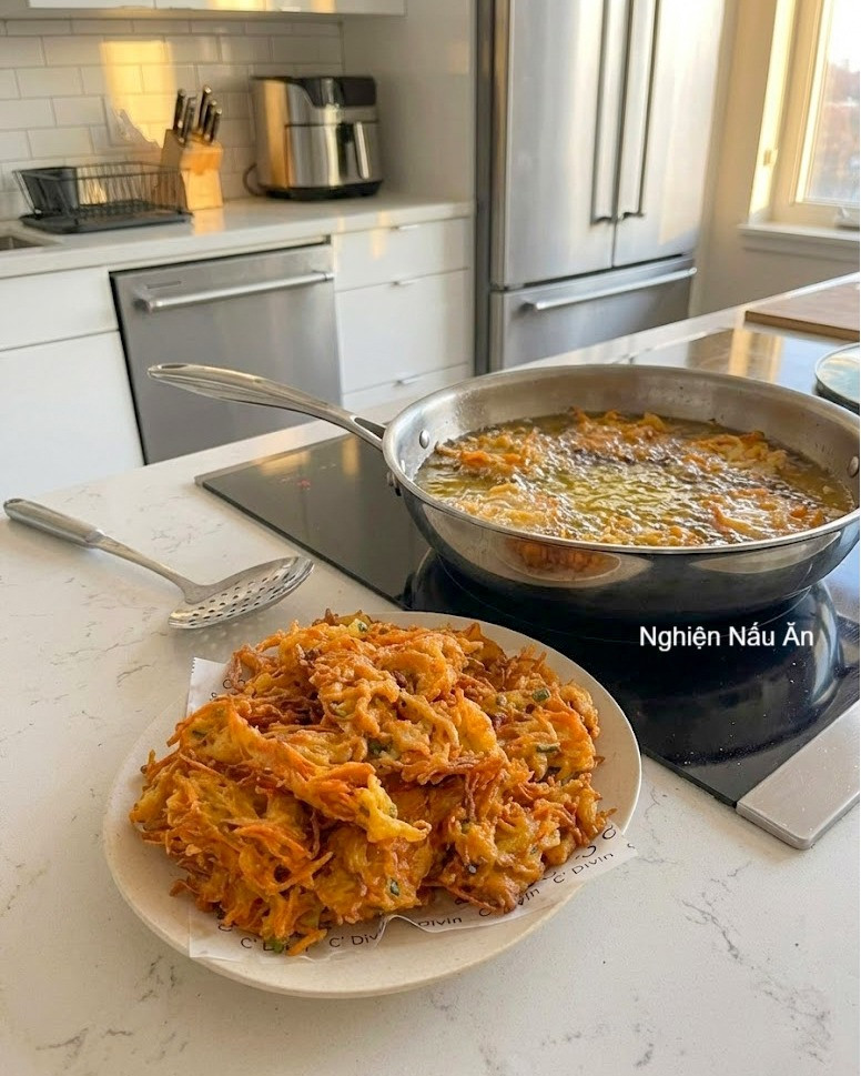 VÀO BẾP VỚI MÓN BÁNH KHOAI CHIÊN GIÒN RỤM ĐƠN GIẢN MÀ NGON KHÓ CƯỠNG NÀY NHÉ CẢ NHÀ. Nguyên liệu: - 1 củ cà rốt - 1 củ khoai tây - 2 quả trứng gà - 1 thìa canh bột mì - 2 thìa bột bắp - Hành lá cắt nhỏ - Gia vị: muối, ngũ vị hươn Cách làm chi tiết: Sơ chế nguyên liệu - Gọt vỏ khoai tây và cà rốt. - Bào sợi mỏng để khi chiên bánh nhanh chín và giòn hơn. Trộn hỗn hợp bánh - Cho khoai tây + cà rốt bào sợi vào tô. - Thêm hành lá, 2 quả trứng gà, bột mì, bột bắp. - Nêm 1 chút muối và một ít ngũ vị hương cho thơm. - Trộn đều đến khi hỗn hợp kết dính. Chiên bánh - Đun nóng dầu trong chảo. - Múc từng muỗng hỗn hợp cho vào chảo, dàn nhẹ cho bánh mỏng để giòn hơn. - Chiên vàng đều hai mặt. - Vớt ra để ráo dầu. Thành phẩm: - Bánh vàng ruộm, giòn rụm bên ngoài mềm thơm bên trong. - Vị ngọt tự nhiên của khoai và cà rốt hòa với mùi ngũ vị hương rất hấp dẫn. - Chấm cùng tương ớt là “hết sảy”! Chúc cả nhà làm thành công mẻ bánh khoai chiên giòn rụm thơm ngon này nhé. #nghiennauan #nghiennauannhalam