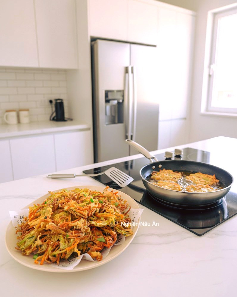 VÀO BẾP VỚI MÓN BÁNH RAU CỦ CHIÊN GIÒN ĐƠN GIẢN, NGON LÀNH, ĂN HOÀI KHÔNG NGÁN Nguyên liệu: - 1 củ cà rốt - 1/2 củ cải xanh (hoặc thay bằng su su) - 2 quả trứng gà - 1 nắm hành lá xắt nhỏ - 2 thìa bột bắp - 1 thìa bột mì - Gia vị: muối, hạt nêm Cách làm chi tiết: Sơ chế rau củ - Gọt vỏ cà rốt và củ cải xanh. - Bào sợi mỏng để khi chiên bánh nhanh chín và giòn hơn. - Rắc 1 ít muối, trộn đều rồi rửa lại cho sạch. - Bóp thật ráo nước để bánh không bị nhão. Trộn hỗn hợp bánh - Cho rau củ đã ráo vào bát. - Thêm trứng gà, bột mì, bột bắp. - Nêm 1 chút muối + hạt nêm và cho hành lá vào. - Trộn đều đến khi hỗn hợp kết dính. Chiên bánh - Đun nóng dầu trong chảo. - Múc từng thìa hỗn hợp cho vào chiên, dàn nhẹ cho bánh mỏng để giòn hơn. - Chiên vàng đều hai mặt. - Vớt ra để ráo dầu. Thành phẩm: - Bánh vàng ruộm, giòn rụm bên ngoài mềm ngọt bên trong. - Vị rau củ tự nhiên hòa với trứng và bột tạo thành món ăn vặt cực cuốn. - Chấm tương ớt hoặc sốt mayonnaise đều ngon. Chúc cả nhà làm thành công mẻ bánh rau củ chiên giòn thơm ngon này nhé. #nghiennauan #nghiennauannhalam