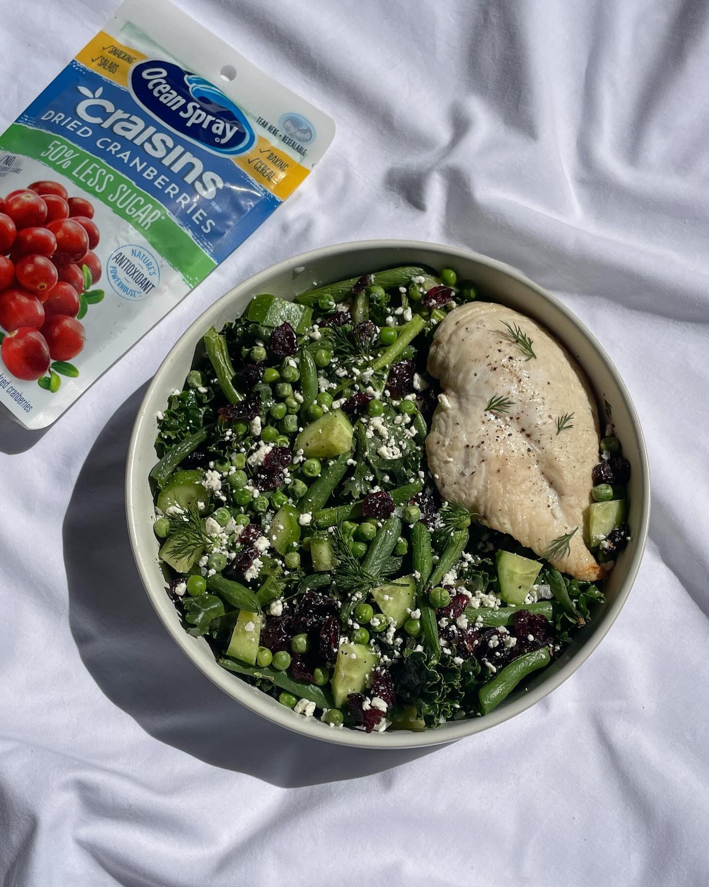 - kale (massaged with oil) - avocado - green beans - 50% less sugar craisins @oceansprayanz - cucumber - crumbled feta - peas - dill - chicken breast