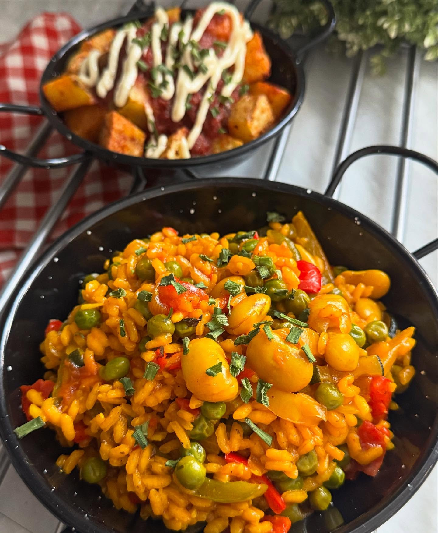 Ingredients: • 2 tbsp olive oil • 1 onion, finely chopped • 3 garlic cloves, minced • 1 red pepper, diced • 1 yellow pepper, diced • 150g green beans, chopped • 150g frozen peas • 200g butter beans (drained & rinsed) • 300g paella rice (or risotto rice if not available) • 1 tsp smoked paprika • 1 tsp sweet paprika • ½ tsp turmeric (or saffron, if available) • 1 tin (400g) chopped tomatoes • 750ml hot vegetable stock • 1 lemon, cut into wedges • Fresh parsley or chives, chopped, for garnish • Salt & black pepper, to taste