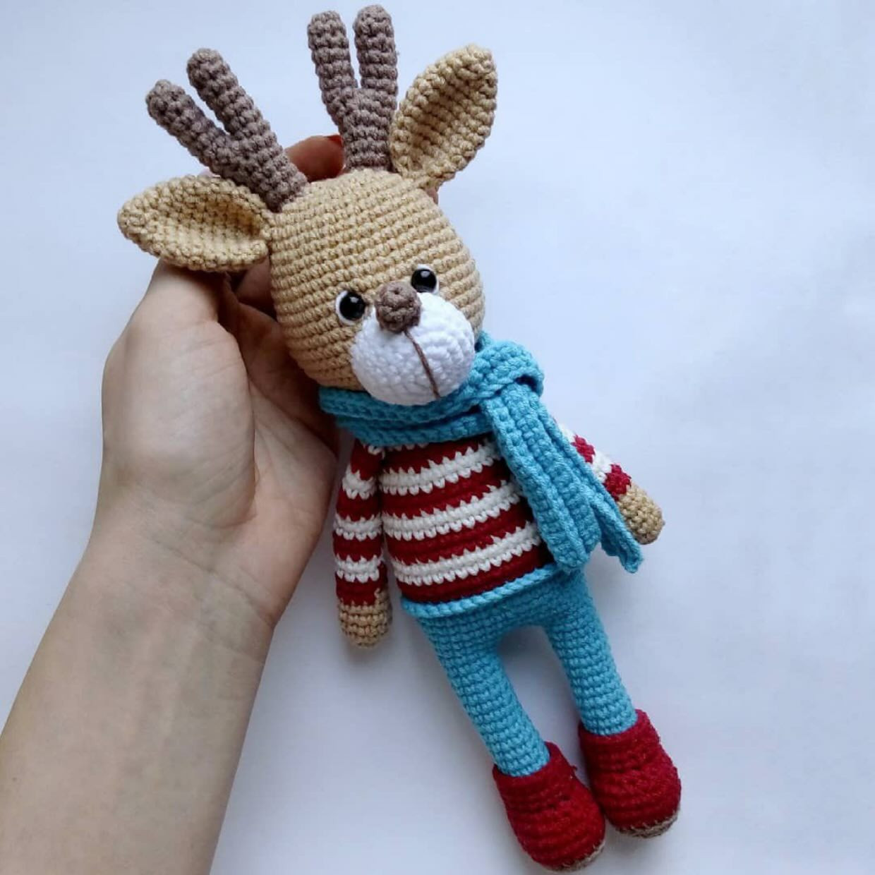 Вязаная игрушка оленёнок в полосатом свитере и шарфе