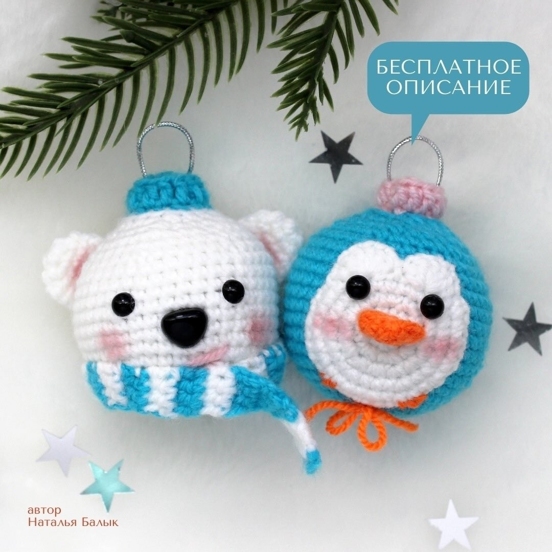 Вязаные игрушки: мишка и пингвин для елочной декорации
