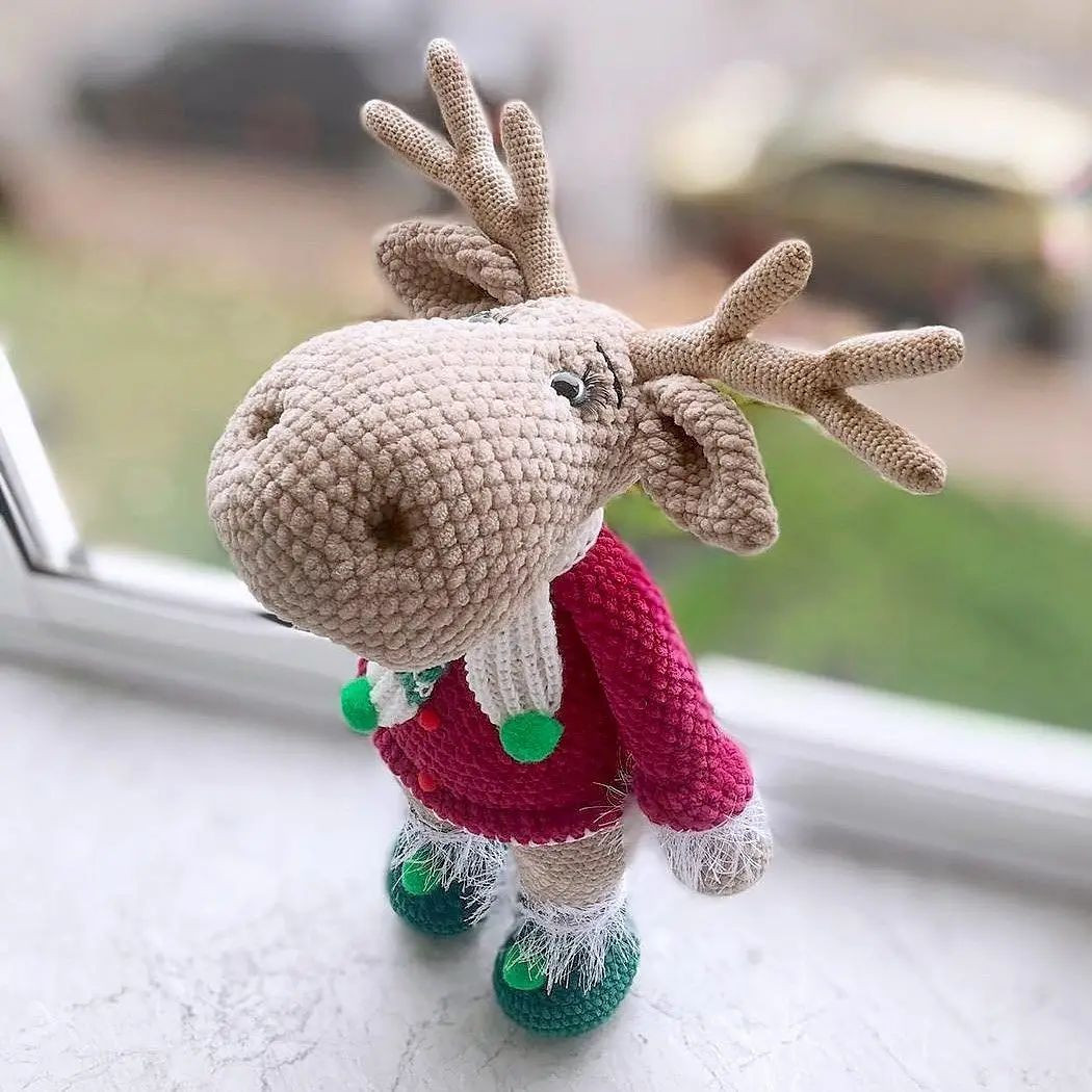 Вязаный лось в рождественском свитере и зелёных ботинках