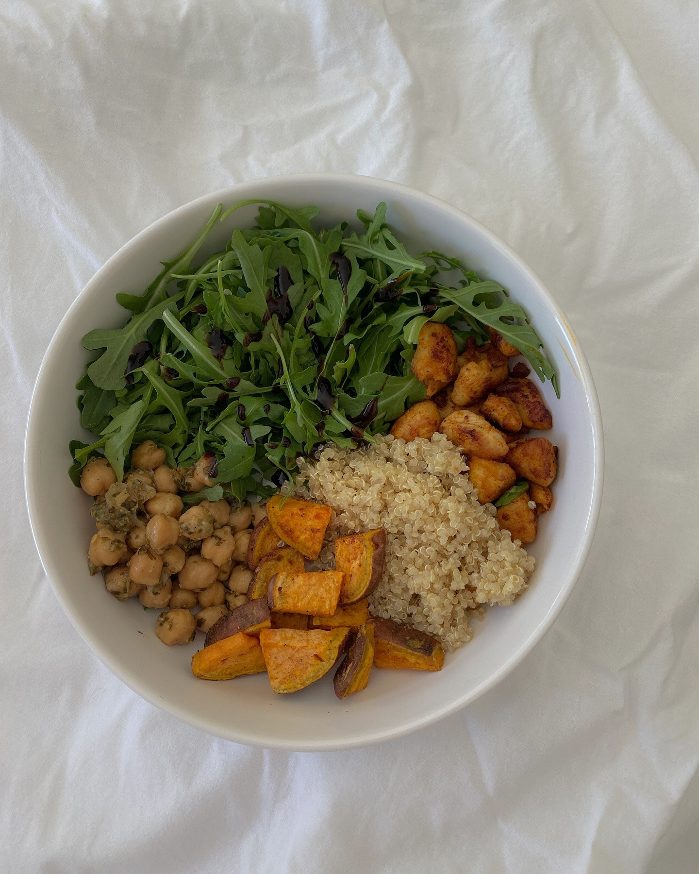 instructions: preheat oven to 400. cut the sweet potato into cubes and toss them with the oil and spices. bake for 30-35 minutes