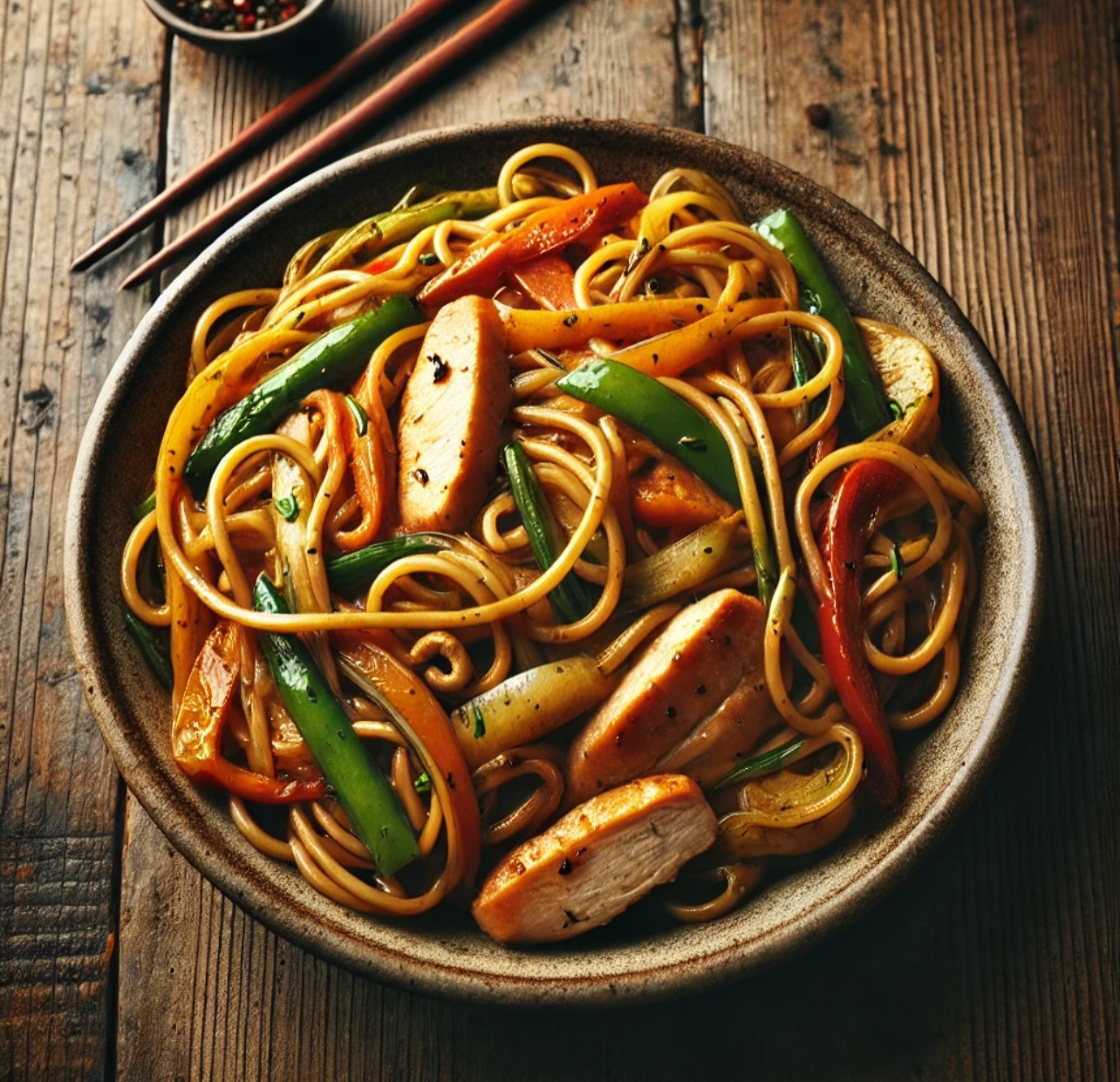 These noodles are all about bold, direct taste: soy sauce-soaked strands, seared chicken, and vegetables that still have bite. No garnish, no restaurant polish — just honest, wok-fired food straight from your own kitchen.