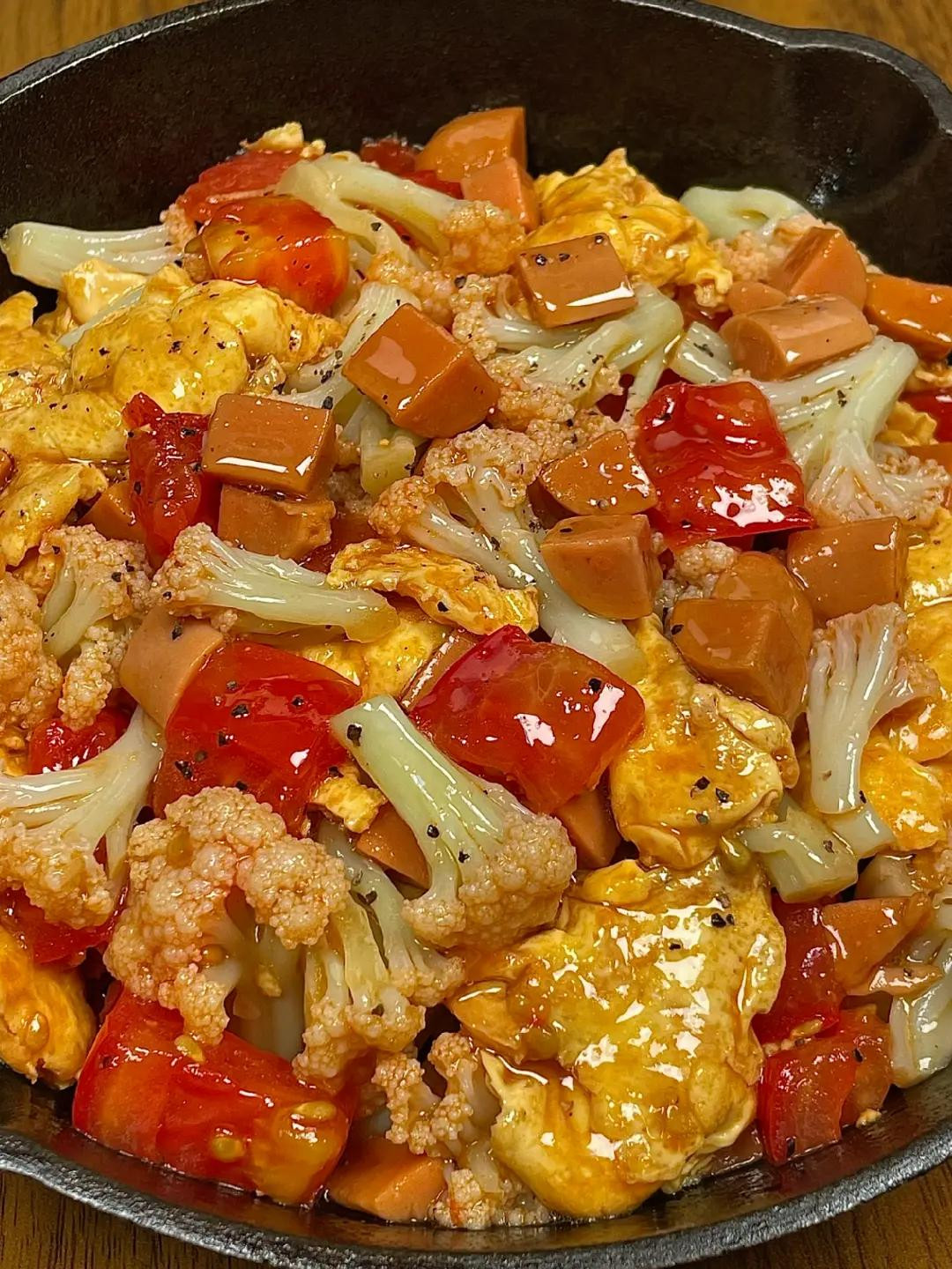 Xào Lạp Xưởng Trứng Bông Cải Đỏ