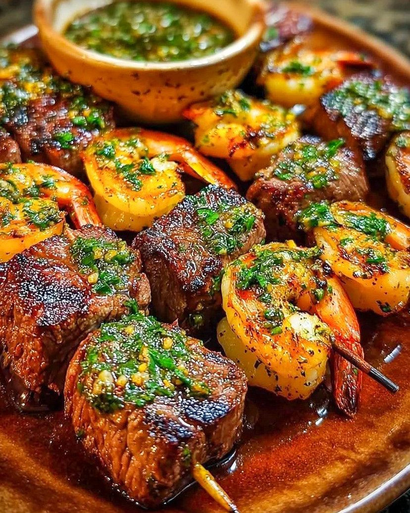 Hôm nay có mấy đứa bạn ghé chơi, mình muốn làm món gì đó vừa nhanh vừa đẹp mắt để cả nhóm ngồi nhâm nhi. Nghĩ một lúc, mình chọn xiên bò thăn và tôm nướng cho gọn, rưới thêm sốt chimichurri thảo mộc lên là thấy món ăn sang vị hẳn liền.