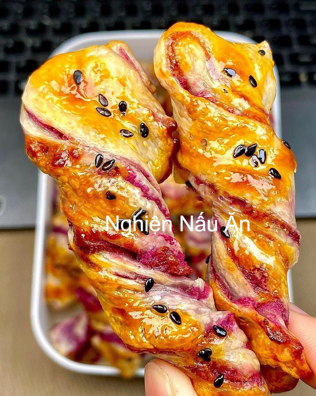 CÁCH LÀM BÁNH KHOAI LANG XOẮN NƯỚNG BẰNG NỒI CHIÊN KHÔNG DẦU. Nguyên liệu: - 200g khoai lang tím - 5g mè đen - 10g đường - 1 lòng đỏ trứng - 1 tấm bột mì cán sẵn - 30ml sữa tươi ko đường Cách làm: - Khoai lang ngh.iền nh.uyễn, trộn với sữa tươi và đường cho mịn dẻo. - Trải tấm bột mì ra. Phết hỗn hợp khoai dọc theo 1/2 phần mặt bánh. Gấp đôi miếng bột lại, ép nhẹ cho dính. - C.ắt bột thành các dải dài (~ 1,5cm), dùng tay xoắn từng dải để tạo hình bánh xoắn. - Đặt bánh vào khay nồi chiên không dầu, phết lòng đỏ trứng rồi rắc mè đen lên mặt. Nướng ở nhiệt độ 180 độ C trong 12-15 phút đến khi bánh vàng thơm là hoàn thành! Chúc cả nhà thành công với cách làm trên.