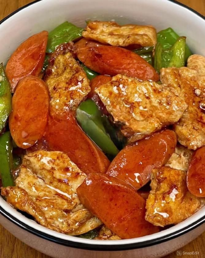 CÁCH LÀM XÚC XÍCH XÀO TRỨNG VÀ ỚT CHUÔNG HẤP DẪN , HAO CƠM . Chuẩn bị nguyên liệu : - 2 quả trứng gà - 2 cây xúc xích - 1 quả ớt chuông - Gia vị : Nước tương , dầu hào , tiêu . Cách Chế biến : 1 . Khuấy tan trứng gà , cho vào chảo chiên chín rồi lấy ra cắt miếng vừa ăn . 2 . Đun nóng dầu cho ớt chuông và xúc xích thái lát vào xào chín . 3 . Tiếp đó cho trứng đã chiên vào , nêm thêm 1 thìa nước tương , 1 thìa dầu hào cùng 1 ít tiêu . Đảo đều cho thấm gia vị rồi tắt bếp , cho ra đĩa ăn cùng cơm nóng . Chúc các bạn thành công với công thức này nhé