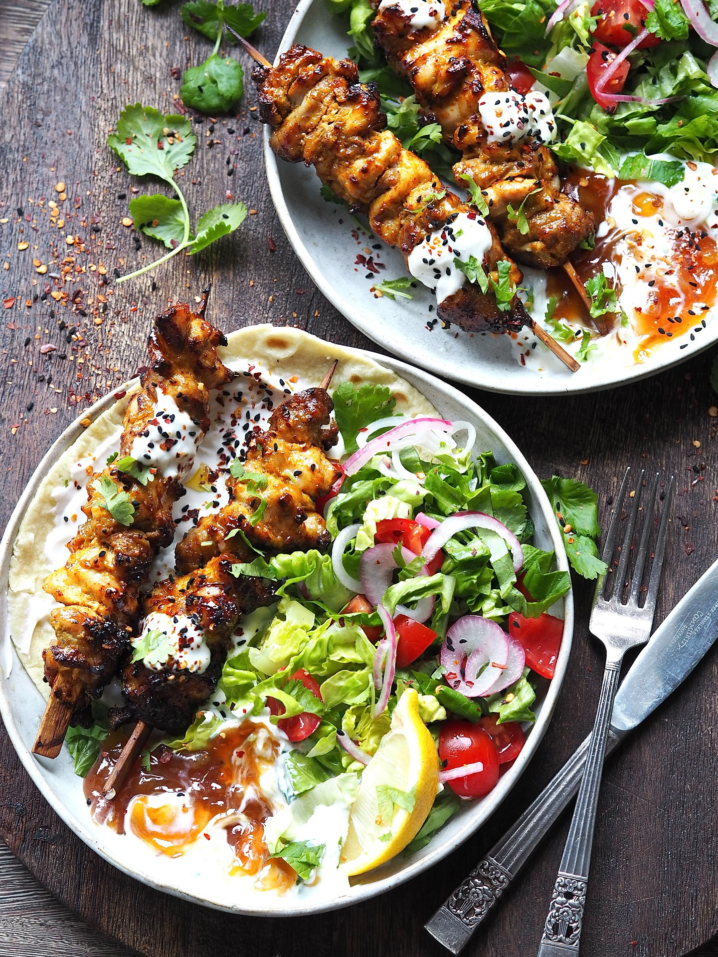 Method: 1. Combine the marinade ingredients in a bowl, dice the chicken into cubes and add to the bowl with the marinade coating well. Allow to mingle for a minimum of 10 mins and up to over night. 2. Air-fry, grill or bbq the skewers. I air-fried at 180c for 20 mins turning half way. 3. Make the glaze by melting the butter and adding the garlic and mango chutney. Once the chicken is done generously brush all over. 4. Serve on warm flatbreads topped with some raita, sprinkle over some nigella seeds, coriander and serve with the quick pickled red onions, a lemon wedge and the salad.