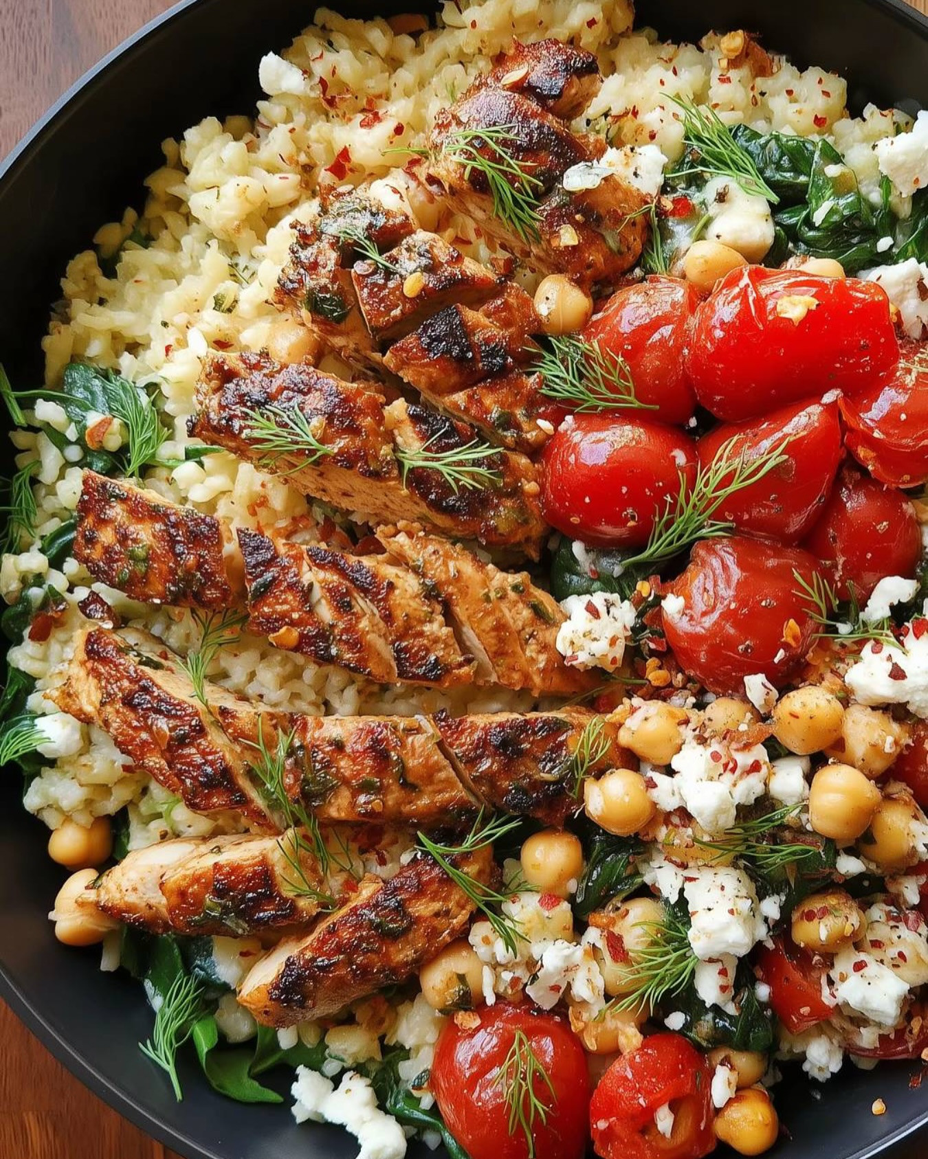 Instructions 1. Prepare the Chicken: In a bowl, mix olive oil, oregano, garlic powder, salt, black pepper, and lemon juice. Coat the chicken in the marinade and let it sit for 15 minutes. 2. Cook the Chicken: Heat a pan over medium heat and cook the chicken for 5–6 minutes per side until golden brown and fully cooked. Let it rest before slicing. 3. Prepare the Rice Mixture: In the same pan, sauté chickpeas, cherry tomatoes, and spinach for 2–3 minutes. Add cooked rice and mix well. 4. Add Flavor: Stir in feta cheese, parsley, dill, lemon juice, and red pepper flakes. Mix well. 5. Assemble the Bowl: Serve sliced chicken over the lemon rice mixture and enjoy!