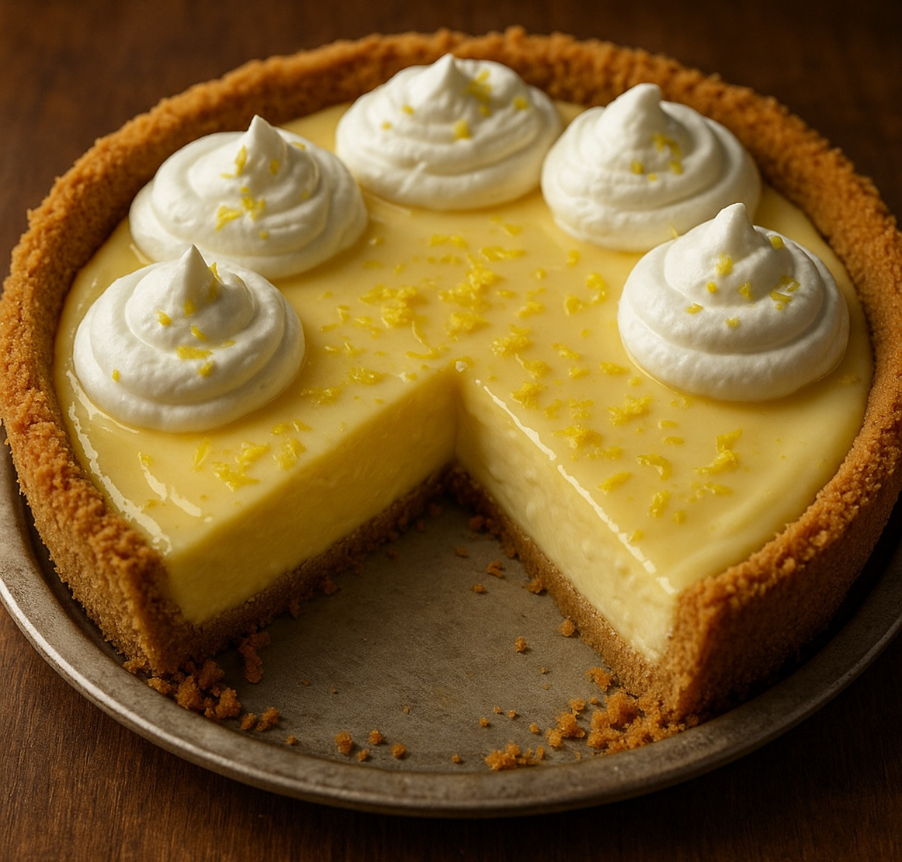 Ingredients: • 1 graham cracker crust (store-bought or homemade) • 1 can (14 oz / 400 g) sweetened condensed milk • 4 egg yolks • ½ cup fresh lemon juice • Zest of 1 lemon