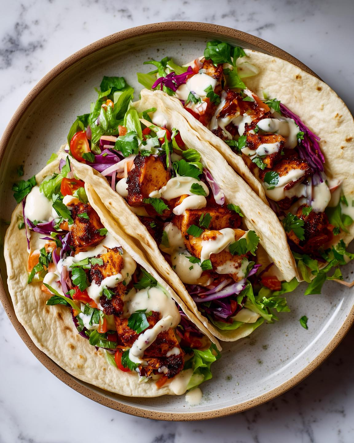 Method 1. In a bowl, toss tofu cubes with olive oil, paprika, cumin, chilli powder, soy sauce, lime juice, salt, and pepper until coated. 2. Heat a non-stick pan over medium-high heat. Cook tofu for 8–10 mins, turning until golden and slightly crisp on all sides. 3. Mix slaw ingredients together in a large bowl. 4. In a small bowl, whisk vegan mayo, lime juice, maple syrup, and garlic powder until smooth. 5. Warm tortillas in a dry pan or oven. Layer with lettuce, slaw, and tomatoes. Add spiced tofu, drizzle with creamy lime sauce, and scatter coriander on top. 6. Serve immediately with extra lime wedges for squeezing.